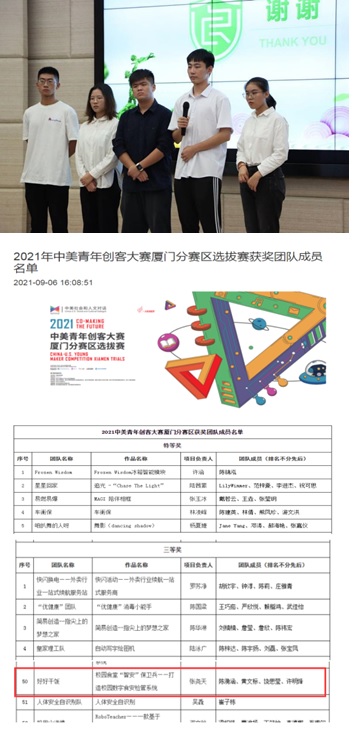 今日,由福建省教育厅主办,厦门大学承办的2021年中美青年创客大赛厦门分赛区选拔赛在厦门大学落下帷幕。经过48小时的“创客马拉松”现场比赛和评委们的作品评审及现场核查,beat365中文官方网站“好好干饭”团队的项目《校园食堂“智安”保卫兵——打造校园数字食安检管系统》(成员:张尧天、饶思莹、陈漪涵、黄文标、许明烽,指导老师:李文清)荣获三等奖。