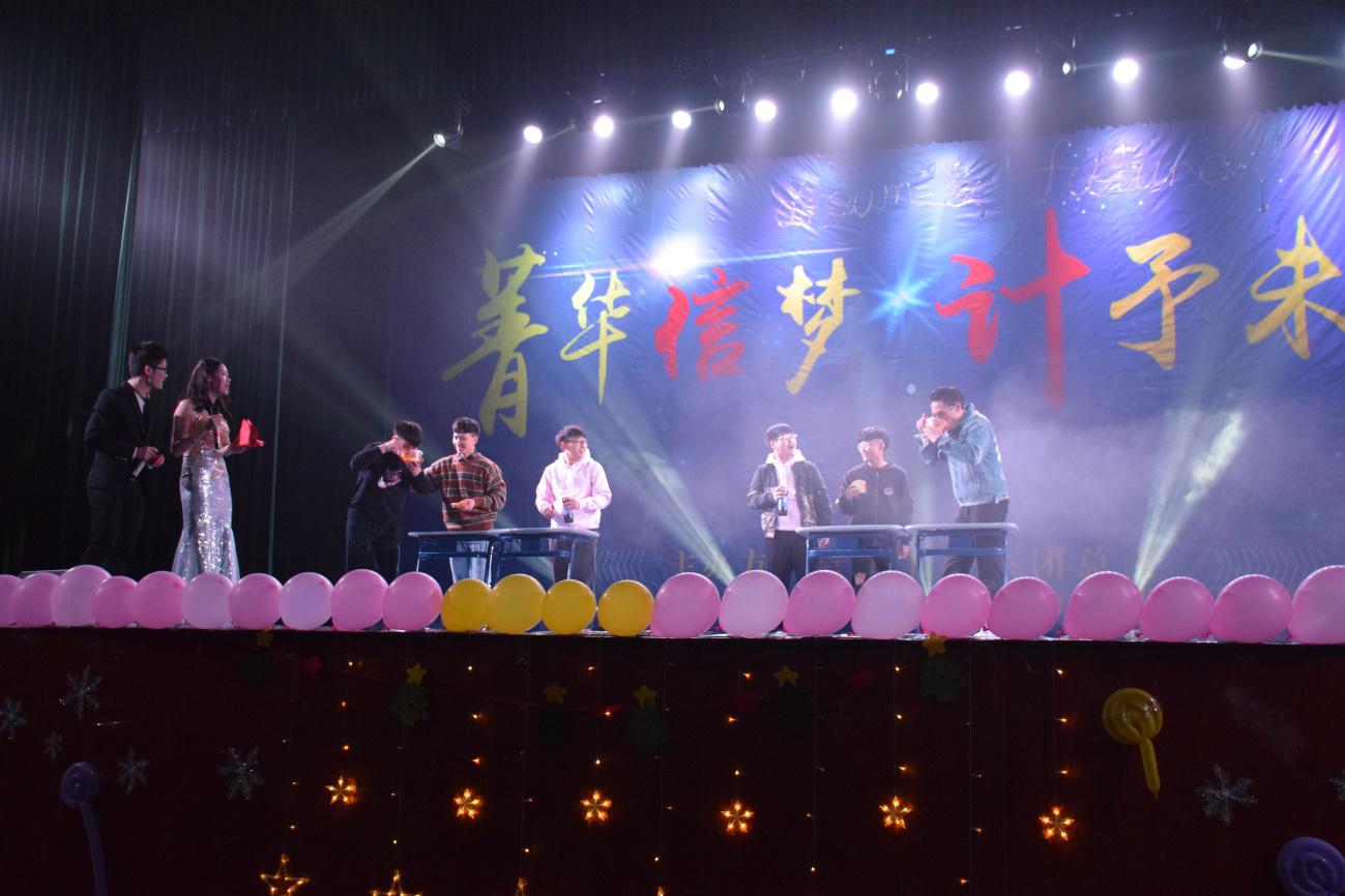 晚上六点半观众席已做满了人,等待着晚会的开始,大家的脸上挂着笑容,对这次晚会充满着期待。晚上七点整,随着充满激情灯光和音乐声响起,晚会在大学生艺术团舞蹈队表演的《Bang Bang 》中正式拉开了帷幕,大家瞬间进入了晚会的气氛中去。《荧光手舞》精彩纷呈,小品《唐朝美人》更是让同学和老师们赞不绝口。聘书颁发、运动员颁奖观众们送上了热烈的掌声。优美的歌曲串烧《爱要坦荡荡+老大+护花使者》以及小品《你扰民了》为在场师生上演了一场视听盛宴,无不彰显着青春的风采,充斥着青春的活力,令观众折服。吉他弹唱《消愁》更是让人想要再来一首。穿插其中的游戏环节“吃火鸡面+芥末面包+喝可乐”比谁快更是将晚会推向了高潮,同学们一个个是积极参与,活动现场气氛热烈。接下来由大二系两委表演的舞蹈串烧更是赢得台下阵阵掌声,欢呼声一浪高过一浪。最后大合唱《北京东路的日子》为本场晚会画上了圆满的句号,主持人宣布2017迎新晚会完美落幕。